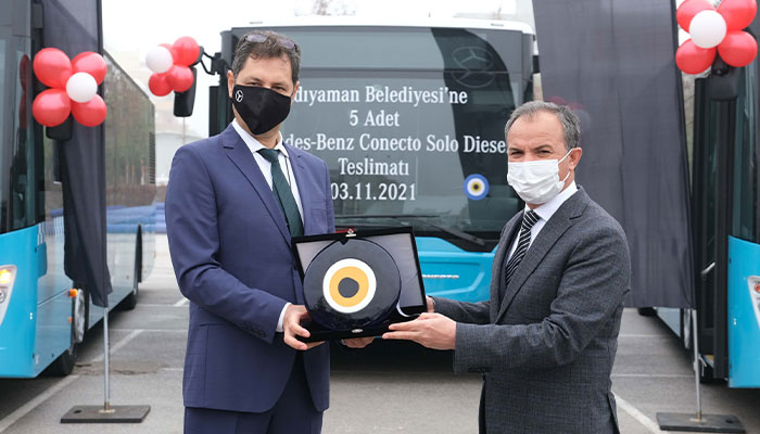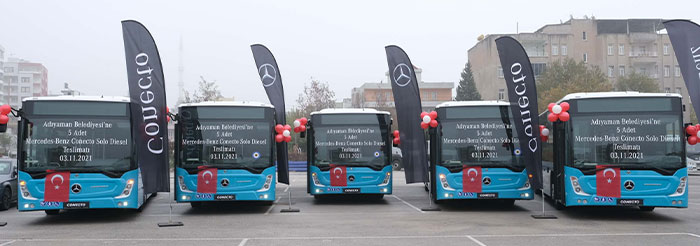 Adıyaman Belediyesi, toplu ulaşım hatlarında kullanılmak üzere 5 adet 2021 model Mercedes-Benz Conecto Solo aracı, Adıyaman Belediye binasında düzenlenen törenle teslim aldı. Adıyaman halkına hizmet verecek olan Mercedes-Benz Conecto Solo; şehir içi otobüs sektöründe Türkiye’de ilk defa sunulan çarpışma önleyici fren asistanı ve dönüş yardımcısı gibi güvenlik donanımlarıyla fark yaratıyor.