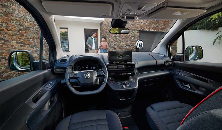 Berlingo’nun iç mekân tasarımı ergonomiyi iyileştirmek üzere geliştirildi. Tamamen yeni ön konsol, kullanıcılara yüksek kalite ve sağlamlık hissi veriyor. Ergonomik olacak şekilde yukarıda konumlandırılan yeni yüksek çözünürlüklü 10 inçlik merkezi dokunmatik ekran ve yeni kişiselleştirilebilir dijital gösterge ekranı teknolojiye vurgu yapıyor. Üst bölümde, büyük bir torpido gözü yer alıyor. Bu ergonomik alan ise hava yastığının tavana monte edilmesiyle mümkün oldu. Orta konsolda; vites seçici, sürüş modu seçici, elektrikli park freni, Start düğmesi ve 2 adet USB soketi bulunuyor. Ayrıca burada kablosuz akıllı telefon şarjı için yenilikçi bir saklama bölmesi de yer alıyor. Bunun dışında Berlingo’nun direksiyon simidi de tamamen yeni. Alt kısmı hafif düz, yeni bir simit tasarımına ve ortada yeni Citroën logosu bulunan daha belirgin birgöbeğe sahip. Kalitesi daha da iyileştirilen direksiyon üzerinde yine ses sistemi ve hız sabitleme kumandaları yer alıyor.