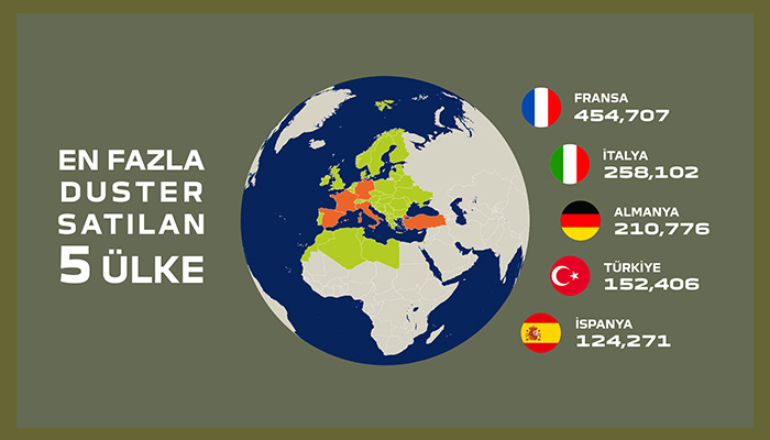 Dacia tarafından 2004 yılında yollara çıkmaya başlayan Logan’ın ardından 2010 yılında tanıtılan Duster, markayı geleceğe taşıyan yeni nesil ikinci Dacia oldu. Erişilebilir, şık ve güvenilir olan Duster, 2010 yılında ihtiyaçlara cevap veren bir model olarak doğarken hızla marka ve tüm sektör için ikonik bir model haline geldi. Bugüne kadar 2 milyon satış adetine ulaşarak büyük bir başarı elde etti. Türkiye 152 bin 406 adetle, en fazla Duster satışı gerçekleşen 4’üncü ülke konumunda bulunuyor.