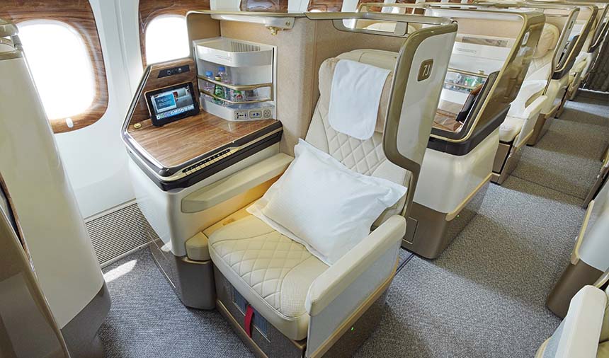 Yeni Emirates 777 Business Class, yolculara daha fazla özel alan sağlayan sıcak ve davetkâr bir kabin içinde yer alıyor. Kabin koltukları ve renk düzeni, Emirates’in ikonik A380 deneyiminin hafif ve havadar tasarım unsurlarını yansıtacak şekilde şampanya rengi süslemelerle vurgulanan yumuşak deri krem koltuklar, daha açık renkli ahşap paneller ile işlevsellik ve lüks sunan modern teknoloji dokunuşlarıyla geliştirildi.