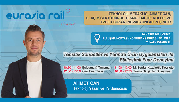 Fuarın ikinci gününde (26 Kasım 2021, Cuma) Eurasia Rail Fuarı kapsamında TÜYAP’TA gerçekleşecek etkinlikte; sektör profesyonelleri, ulaşımda yeni nesil teknolojiler ve ezber bozan inovasyonlar peşinde olan Teknoloji Yazarı ve TV Sunucusu Ahmet Can eşliğinde fuar katılımcılarının stantlarını ziyaret ederken firmaların değişen tüketici ihtiyaçlarına cevap olan ürün ve teknolojilerini irdeleyecek.