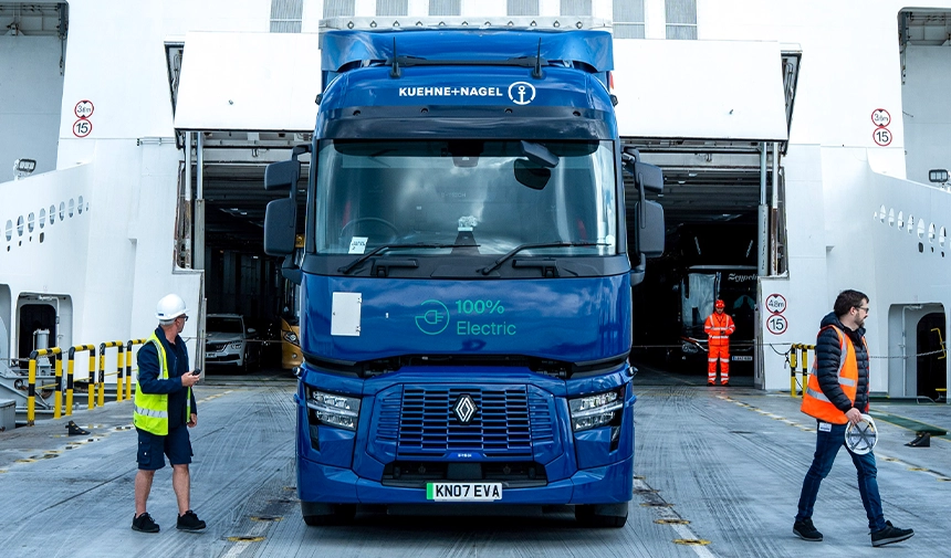 Kuehne+Nagel, Renault Trucks E-Tech T modeli ile İngiltere’den Fransa’ya yük taşıma işlemini başarıyla tamamladı. Tam elektrikli kamyon, rotasını P&O Ferries’e ait hibrit bir feribotla tamamlayarak yük taşımacılığının karbon ayak izinin azaltılmasında önemli bir gelişmeye işaret etti.