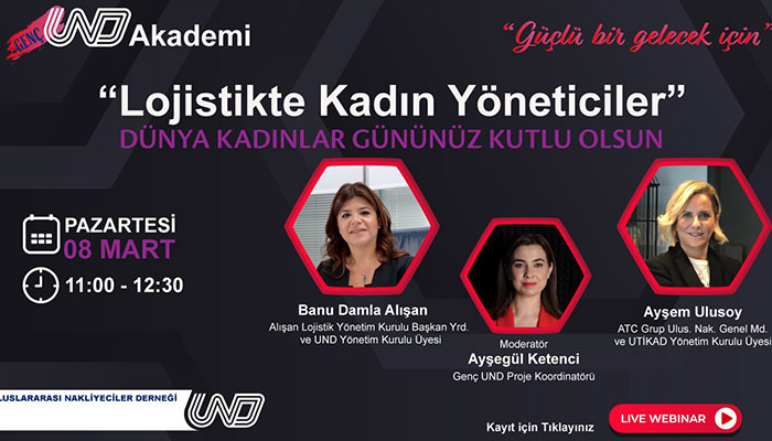 UND “ 8 Mart Kadınlar Günü ”nün anlamına ilişkin, 8 Mart’ta Genç UND Akademi katılımcılarına sektörde tanınan kadın yöneticilerin katılımıyla “Lojistikte Kadın Yöneticileri” konulu bir webinar düzenleyecek olup, ayrıca UND Yönetim Kurulu Başkanı Çetin Nuhoğlu, Genç UND Kadın Üyeleri ile birlikte online sohbet toplantısında bir araya gelerek, kadın üyelerinin sektöre ilişkin görüş, talep ve geleceğe yönelik hedefleri değerlendirecek.