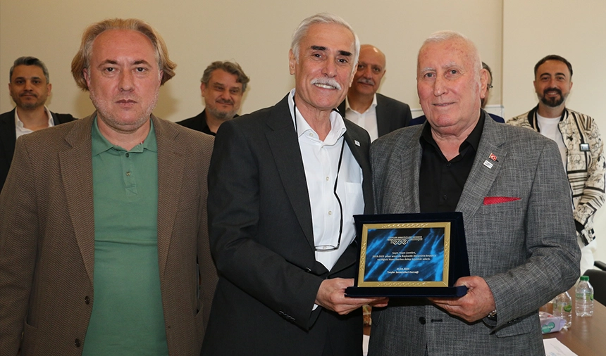 TREDER Başkanı Seyit Arslan ve Divan Başkanı Mehmet Dinçer eski başkan Yalçın Şentürk’e yaptığı katkılardan dolayı teşekkür plaketi sundu.